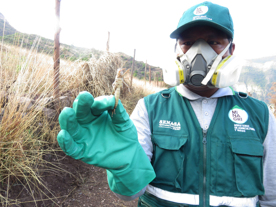 Los servidores del campo detectaron la aparición de langostas migratorias en áreas de vegetación silvestre en la comunidad de Urubamba y en coordinación con los productores de la comunidad, integraron brigadas para realizar el control químico y evitar su diseminación hacia los campos agrícolas.